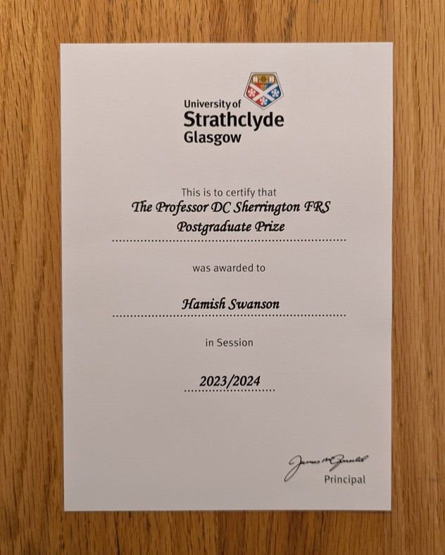 Congratulations to Dr. Hamish Swanson, who has been awarded The Professor D.C. Sherrington FRS Postgraduate Prize from the Department of Pure and Applied Chemistry at the University of Strathclyde. This prestigious award recognizes the PhD thesis that best demonstrates both scientific excellence and outstanding presentation.